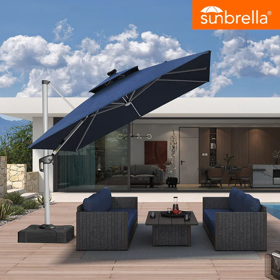 The PURPLE LEAF Double-Top Cantilever Sunbrella Umbrella features an integrated luxury LED lighting system. Its solar panels atop the canopy efficiently capture sunlight for power, delivering dual functionality in one purchase. During the day, adjust the angle to shield against the harsh sun. At night, illuminate your dark backyard, creating a romantic ambiance for post-dinner relaxation.
